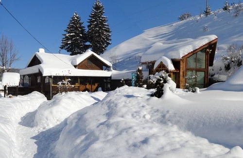 Rustic ski chalet for up to 15 people with sauna jacuzzi gym large BBQ area large ground covered parking for 3 cars south facing A1 mountain views next to a river stream going through the ground host/driver 24/7 airport transfers included and trip to ski centers.mountain bikes on site ,local taxes included.open fires in each of the chalets.the main one is for up to 10 people and the newer one -up to 5.