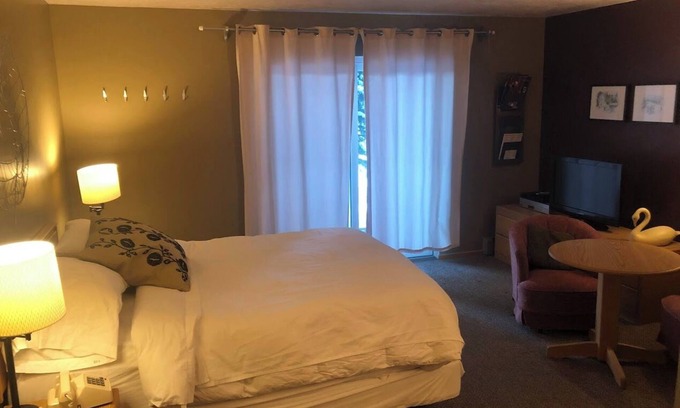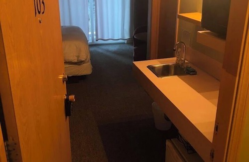 Columbine Inn Room 103 located at Powder Mountain resort center, features one queen bed and a full futon with full bath and kitchenette.. Ski right to your room's sliding glass door and small deck that has a view with a view of the Sundown lift that is lit up at night. On-site free front row parking, free WiFi, free laundry facilities. Additional rooms available. Only 30 min. to Snowbasin 20 min. to Nordic Valley. 10 Min. to Pineview reservoir.