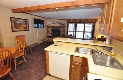 SKI-IN-SKI-OUT one bedroom chalet at Whitecap Mountains Ski Resort. Slopeside chalet lower unit is strategically placed along the Grenoble ski run and just a few feet off the scenic shores of Weber Lake. The European style construction features your very own cedar sauna, living kitchen and dining area, and a private outdoor deck affording dramatic waterfront and mountain views. Enjoy the 43 ski runs of Whitecap, ice fishing and ice skating right outside your front door! The alpine setting offers breathtaking views along with a charming vintage decor.