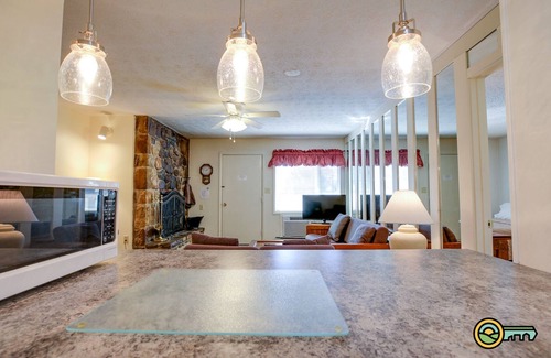 This unit was recently updated with new kitchen cabinets and countertops, new kitchen and bathroom flooring, and new bathroom appointments. It has a galley-style kitchen and dining is convenient either at the eat-at kitchen bar or a small seating area adjacent to the living room and kitchen. The living room features a substantial stone fireplace, rustic furnishings (including a sleeper sofa), a flat screen TV, and an elevated view of the beginner ski slope. The bedroom includes two queen beds and a flat screen TV. The bathroom features separate powder and shower/commode rooms. The condo comfortably accommodates four.