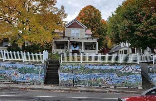 The House: This Queen Ann Cottage features three bedrooms, one has two full size beds and a smart TV, one has a queen size bed, and a smart TV, and the other has a bunk beds, and a full sized bed. All are on the second floor. There are also two full baths, one of which has a whirlpool tub. There is a fully equipped kitchen that is open to the dinning room, a living room with cable and smart TV. There is also a laundry/mud room for all your gear, and a beautiful wrap around porch with chairs to enjoy the view of Main Street and the mountains. If you like architecture, this house has plenty of details to enjoy, from the quarter sawn oak staircase with oak paneled walls, to the stained glass windows or the beautiful inlaid parquet floors and the antique coal burning fireplace (please burn artificial logs only).