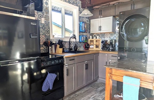 Kitchen amenities: Popcorn maker, toaster, handheld mixer, stock pot, roasting pan, microwave, oven/stove, refrigerator. Dish & hand soap, oil, salt, pepper, spices, and paper towels provided.