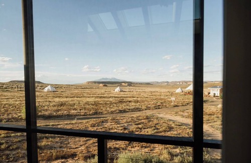 Our custom made casita has been thoughtfully built and designed by us for those looking for that extra glamping comfort. 8 skylights line the roof to make the most of sky watching and stargazing. Our only solar powered unit has AC/heat, outlets, a mini fridge and a kettle. This unit can sleep up to 4 guests with a king bed, a queen bed in the loft, a cozy couch, large dining table and large windows. Adirondack Chairs, hammock swings and a porch swing wrap around the 3 sides of the private deck.