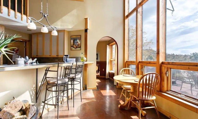 A “Net-Zero” energy stucco home with passive solar design. Thoroughly updated with decorative concrete floors, low VOC wool carpet & paint. Designer kitchen with hickory & shoji cabinets which compliment the granite/quartz tiles and copper edging, stainless appliances. Kitchen fully stocked with cooking and baking essentials, dishes, glasses etc. There are 3 eating spaces, bar in the kitchen, and breakfast table in the atrium, with separate formal dining room. The main floor also contains a full bath off the mud room. Upstairs there are 3+ bedrooms and two full bathrooms. The master suite features custom lighting, double ended soaking tub, with separate walk in shower and marble floors. The top floor is magical with 3rd quiet bedroom, and entertainment room with custom balcony skylight. Best views in the house! Outdoors there are decks on 3 levels with gorgeous mountain views. Be sure to enjoy the hot tub and infrared sauna during your stay!