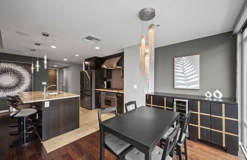 Soothing shades of cream and grey create a tranquil modern oasis in the midst of the city in this one-bedroom, one-bathroom condo. The space is appointed with minimal but comfortable furnishings that make for a relaxing and uncluttered space. The main living area is centered on an extra-large sofa with an abundance of comfortable cushions and pillows situated in front of a sizeable Smart TV. The kitchen and dining room offer multiple seating options, with bar stools at the island for a quick meal, or a dining table under a shimmering chandelier for a more formal option. The dining room also boasts a built-in wine fridge within the cabinet next to the table. If you are looking to work from home, you will love the desk in the corner of the living room that benefits from ample natural light from the large windows surrounding it. A plush full-size bed with a chic quilted headboard is the focal point of the bedroom suite, that also has an expansive walk-in closet, a Smart TV, an en-suite bathroom with a spacious dual sink vanity, and a convenient combination shower-and-bathtub. The patio features comfortable lounge seating and offers enchanting views of the cityscape and San Diego Bay.