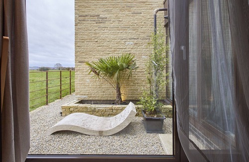 Glass doors lead to a private terrace and lawn, providing stunning views of the countryside. The outdoor area is ideal for relaxing and spending time with your group.