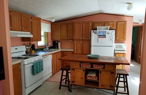 On the property you'll find a fire pit for enjoyable campfires. Fire wood furnished, as well as a gas grill. It is a light and airy property but shade is also provided by magnificent pines. The back half of the property is wooded. There are two dining areas outside - one near the grill and the other on the deck. Each seat 6. The home has a full kitchen, a kitchen island that serves as the dining table and game space, and dishwasher. You'll be able to spread out and relax in this comfy home! Central heating and cooling.
