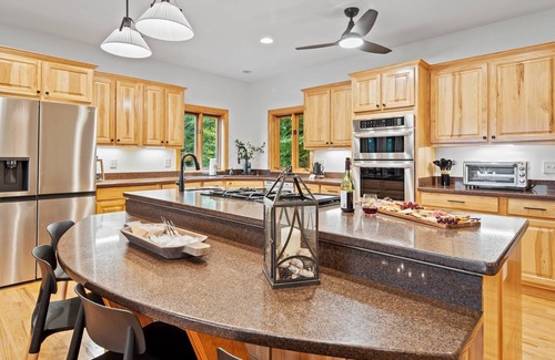 Outside, you'll find large expansive decks, main level deck with a hot tub, perfect for soaking in after a long day of skiing, hiking, and waterfalls. This deck offers bar seating for optimal viewing as far as the eye can see and taking in the fresh mountain air! There's also a gas grill for outdoor cooking and a fire pit for cozy nights under the stars and s'mores! This is also the perfect spot to sip your morning coffee from our expansive coffee bar!