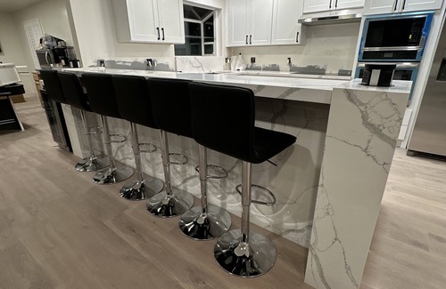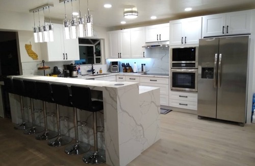 Back in the entry way, you'll head towards the kitchen, living room, and family room, and they will not fail to amaze you. The luxurious dining area has a built in custom marble kitchen table that seats 14 and a breakfast bar seating up to 6 and the remodeled kitchen is fully stocked with brand new appliances, dinnerware, cookware, and more!