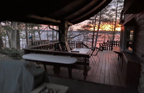This wonderful, private Chalet-Style home is the perfect place to gather with your favorite people! Open-concept/very large, comfortable entertaining areas on 2 levels. 4200 square feet! Tons of room to gather…or sneak off for a nap! The spacious, well-stocked “chef’s” kitchen is a great layout…and has all the essential cookware to prepare meals without being crowded…or being excluded from the activity on the main level and patio. The wonderful, large dining table and benches seats 16 adults…and seemingly countless kids. The adjoining granite kitchen island seats many more…and the covered patio is just outside the dining area. The large covered deck/patio features a gas grill area, table space for 8-10…and lots of deck chairs. Everyone can eat together! Plenty of service and storage space, too! Indoor and outdoor dining areas offer built-in buffet/bar serving space for your meals and “happy hours,” too! Bedrooms galore…7, in total- on 3 of the 4 levels. 4 bathrooms, all with bathing facilities. 2 TV areas…with cable channels and streaming…but also lots of indoor and outdoor privacy/quiet spaces to visit, play board games, craft, or just enjoy the solitude. The deck/patio is just 6 steps above the yard. The “walk-out” lower level is another way to get to the fire pit area and the private lakefront beach. There is a swing-set and kiddie swing area around in the front yard area. The boathouse/deck and beach area await! On the waterfront, a flat sand beach area…and an additional 16x14’ deck rests atop the boat house. It is an ideal spot to soak up some sun, star-gaze, keep an eye on the lake activity, or enjoy a cool beverage as you wind-down your day with an epic lake sunset. Adirondack and Beach chairs, 4 kayaks, 2 paddle boards…and a canoe are available for your use. Life vests provided and required, please. Bring or Rent a boat…Take a dip off the private 40 foot dock, drop a fishing line, put your feet up, hop a boat…or paddle off for an adventure! Shallow graded access is ideal for all ages and swimmers. We are excited to share our place with you! We know you will love it here…and will long to return!