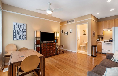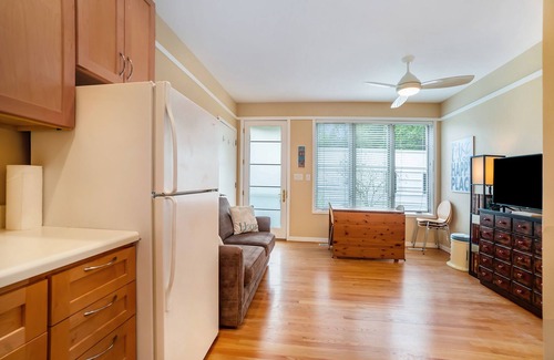 OPEN CONCEPT LIVING ROOM/KITCHEN COMBINATION: The cottage features an open concept design with a living room and kitchen combination. The living room includes a queen pull-out couch, providing additional sleeping space.