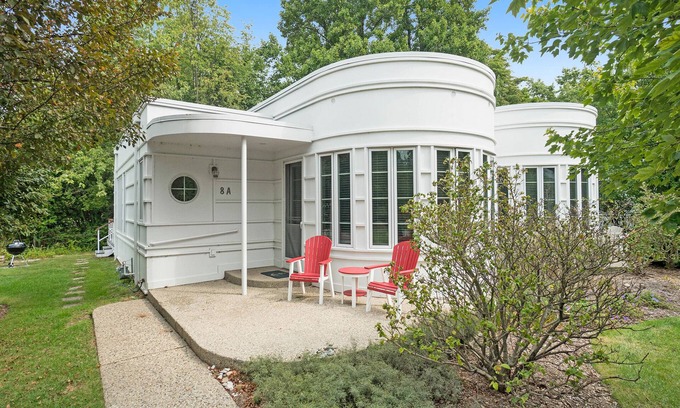CURVED FRONT ARCHITECTURE: This cottage boasts unique curved front architecture, adding character and charm to the exterior.
