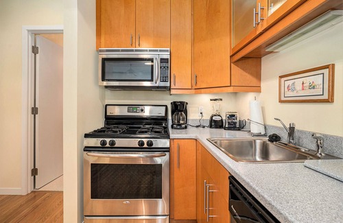 SUN-FILLED LIVING ROOM/DINING ROOM COMBINATION: The unit boasts sun-filled areas, particularly the living room and dining room combination. A queen-size pullout sofa provides additional sleeping space if needed.