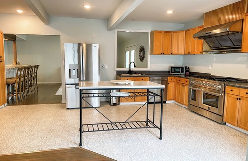 A spacious 3000+ square feet of home with 6 rooms to sleep and 4 bathrooms. Room in the kitchen to cook on the 8 burner stove and double oven. Dining room table to fit everyone. Two living rooms - each with a TV. Game room. Porch for puzzles. Outdoor deck. Outdoor side porch. Pool (Unheated, landscape pending).