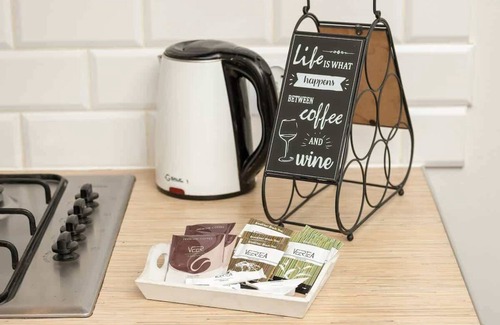 Fridge with freezer, oven, gas stove, kettle, glasses, set of pots, cutlery, frying pan, wine glasses.