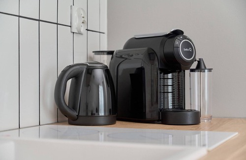 Electric hob, fridge with freezer, coffee machine, kettle, glasses, cups, crockery and cutlery set