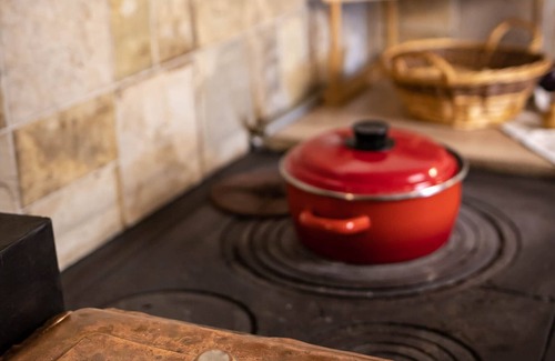 It spreads on 2 levels and with its bright wooden surfaces brings greater connection with the natural surroundings. This home has preserved elements of the original kitchen from the time when cooking using wood powered stoves and warm hearth was the place of everyday gathering. It is blended with modern functionalities and a big kitchen countertop that calls for creation of memories and indulging in food.