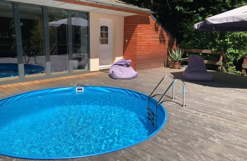 There is a bar table for meals together, looking out at the wooden terrace that has garden furniture and a grill. Pets are allowed on request.