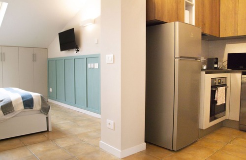 It is a studio apartment with a fully equipped open kitchen, double bed and bathroom with shower.