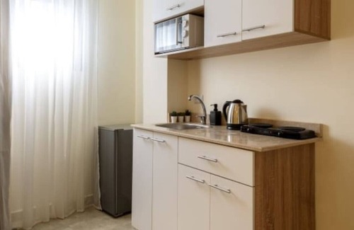 Living and Sleeping Area: A convertible Queen bed offers comfort while maximizing space. The coffee table transforms into a dining or work table, making the most of the studio's layout. Enjoy entertainment with a Smart TV and stay connected with free high-speed WiFi (25+ Mbps).