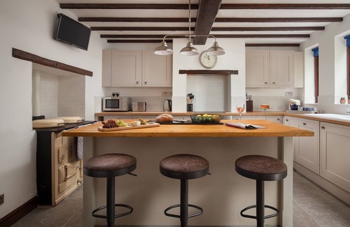Large, well-equipped kitchen with an electric oven and hob, microwave, dishwasher, washing machine and Freeview television (the Aga is decorative only).