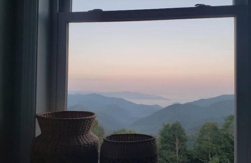 Beautiful scenic amazing views through the Great Smokey Mountains National Park Blue Ridge Parkway. Breath taking panoramic views spanning to Clingman’s Dome and wrapping around the Blue Ridge Mtns of NC and TN. Access to Harrah's Cherokee Casino, minutes from Cataloochee Ski Resort, Soco waterfall, numerous hikes throughout the Smoky Mtns National Park, recreational activities, getaway, Newly built House/Cabin. Hot Tub View overlooks a pond with water fall. SMOKEY, SMOKY MOUNTAINS. Pet Friendly