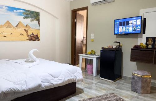 Featuring 4-star accommodations, Sneferu Pyramids Golden Gate is located in Cairo, 1.3 miles from Great Sphinx and 2 miles from Giza Pyramids. Among the facilities of this property are a restaurant, room service and a 24-hour front desk, along with free WiFi throughout the property. Guests can enjoy garden views. The hotel will provide guests with air-conditioned rooms offering a closet, an electric tea pot, a fridge, a safety deposit box, a flat-screen TV, a terrace and a private bathroom with a shower. At Sneferu Pyramids Golden Gate each room has bed linen and towels. Cairo Tower is 10 miles from the accommodation, while Mosque of Ibn Tulun is 10 miles away. The nearest airport is Sphinx International Airport, 21 miles from Sneferu Pyramids Golden Gate.