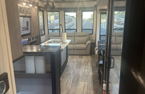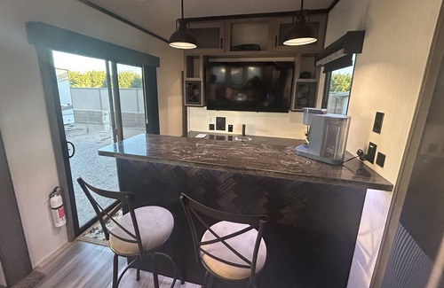King size bed in bedroom with lots of dresser space and big closet. Power love seat and full size couch in living room plus electric fireplace. Outside you’ll find a BBQ and propane fire pit. Will have access to all park amenities. It is an rv with holding tanks, will need to be emptied. Propane will be paid and filled by renter