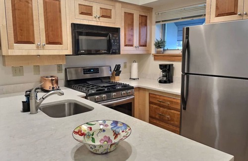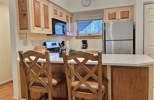 The end unit condo has easy access with parking out front and a private entrance. Entry to a ski storage area with a large closet for all of your adventure gear. To the right is a king bedroom, with TV and en suite full bathroom. Linens and toiletries are included. To the left is a spacious open concept living / dining / kitchen. The beautiful kitchen is fully stocked with curly maple cabinets and quart countertops. The dining area has a gorgeous Simon Pierce Vermont barnwood table. The living room has an enormous 75 inch Roku TV, stream all your subscriptions. There is a second King bedroom, with a TV and full bathroom. Also on that floor is a washer dryer. Upstairs, there is an open loft with a double (full) bed and a twin (single) bed. There is also an desk to work from home with a printer. Finally, a PacMan arcade game is sure to delight both young and old. Try for the high score.