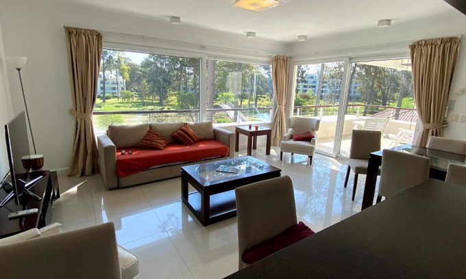 Surrounded by views of the pool, Solanas Green Park Apartamento Penthouse 2 Pisos, Vista al lago en Esquina is a sustainable condo hotel in Punta del Este, offering guests an environmentally friendly accommodation close to Solanas Beach. This property offers access to a balcony, ping-pong, free private parking, and free Wifi. A private beach area, meeting and banquet facilities, infinity pool, outdoor fireplace, sauna, hot tub and water park are at our guests' disposal. Providing a terrace and lake views, the spacious condo hotel includes 3 bedrooms, 2 living rooms, satellite flat-screen TV, an equipped kitchen, and 3 bathrooms with a hot tub and a bidet. Offering air conditioning, the condo hotel offers Xbox One, Blu-ray player, and a CD player. The condo hotel offers bed linen, towels, and daily room service. Guests can eat at the on-site family-friendly restaurant, which is open for dinner, brunch, and high tea. Yoga classes and fitness classes are organized at the fitness room on site. For guests with children, the condo hotel provides kids pool, an indoor play area, and outdoor play equipment. Both a bicycle rental service and a car rental service are available at Solanas Green Park Apartamento Penthouse 2 Pisos, Vista al lago en Esquina, while cycling and fishing can be enjoyed nearby. Punta del Este Bus Terminal Station is 10 miles from the accommodation, while The Fingers beach is 10 miles away. The nearest airport is Capitán de Corbeta Carlos A. Curbelo International, 2.5 miles from Solanas Green Park Apartamento Penthouse 2 Pisos, Vista al lago en Esquina, and the property offers a paid airport shuttle service.