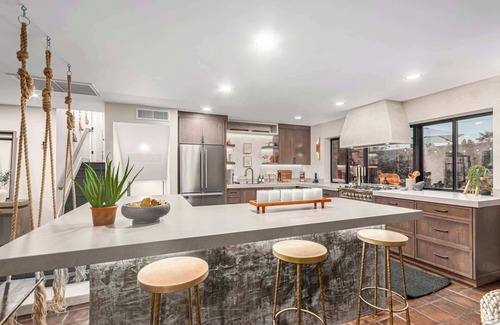 Discover luxury and style at The SolaNova Designer Retreat, a 2,200 sq. ft. Scottsdale oasis by Krafted Renovations. This freshly renovated home features 4 elegant guest suites, spa-inspired bathrooms, a theater living room with a 100" screen, and a unique split-level layout. Outdoors, enjoy a heated cocktail pool/hot tub with a waterfall, a firepit, loungers, and ambient bistro lighting. Perfect for a serene yet stylish getaway near Scottsdale's top attractions.