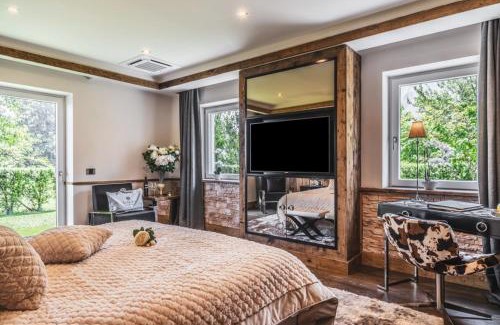 Food & DrinkMinibar, Bottle of water, Tea/Coffee makerBathroomToilet paper, Guest bathroom, Free toiletries, Body soap, Bathrobe, Bathtub, Shower cap, Slippers, Private bathroom, Shampoo, Hairdryer, Shower, Spa tub, Toilet, Bathtub or shower, Towels, BidetGeneralKey card access, Hypoallergenic, Heating, Smoke Alarm, Private entrance, Hardwood or parquet floors, Trash cans, Safe, Air conditioning, SoundproofMedia & TechnologyFlat-screen TV, Telephone, Satellite channels, TVActivitiesHot tubLiving AreaDesk, SofaBedroomWalk-in closet, Wardrobe or closet, Childrens' cribsViewGarden view, Mountain view, ViewKitchenElectric kettle, Coffee machineAccessibilityUpper floors accessible by stairs only, Emergency cord in bathroomRoom AmenitiesClothes rack, Socket near the bed, Non-feather pillowPool and SpaPool towelsLayoutWindow |