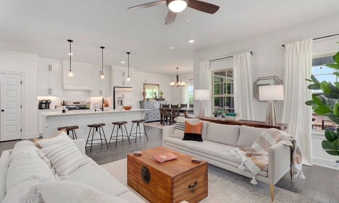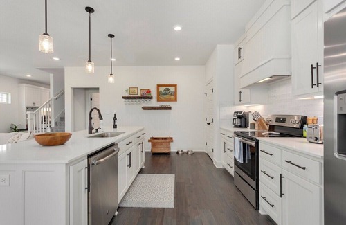Our home offers a 2-car garage, a fenced-in backyard, a back patio with a new hot tub (temporarily out of service), desk space, and a fully stocked kitchen for guests to enjoy. There are two televisions: a 60-inch Smart TV in the living room over the fireplace and a 32-inch TV in the master bedroom. Decorated in a cottage-modern style with white linens, natural woods, plants, and scenic art, our home provides a cozy and aesthetic atmosphere. You'll find plenty of restaurants within a 3 to 5-minute drive or a 10-minute drive to Downtown Fayetteville. It's also just an 8-minute straight shot to the University of Arkansas!