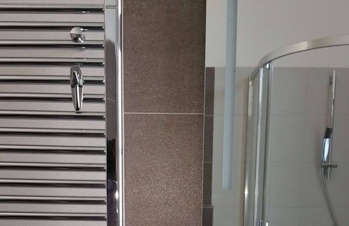 The large bathroom gets a lot of daylight and has a shower, towel heater and hair dryer.