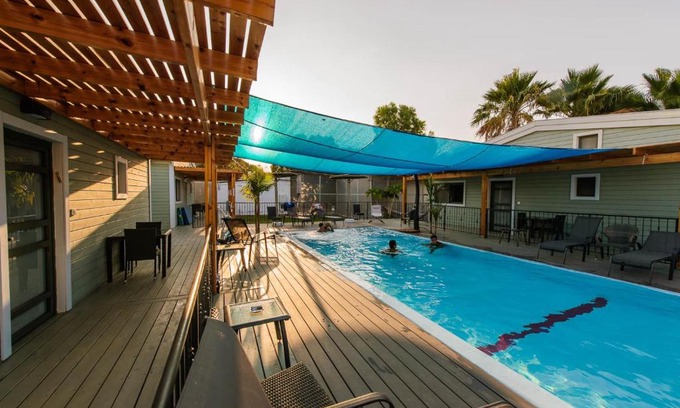 Featuring an outdoor swimming pool with sun loungers and parasols, Somewhere - Chalets in the Arava enjoys a secluded location in the middle of desert. It offers elegant self-catering accommodations with free Wi-Fi. Decorated in wooden theme, this air-conditioned chalet consists of a furnished balcony, flat-screen satellite TV and an equipped kitchen with dining area. The bathroom includes a spa bath and free toiletries. Barbecue facilities are provided. Bedouin-style restaurant and a grocery store can be found a 2-minute walk away. Thai food cooking lessons are organized at the Somewhere - Chalets in the Arava. In the area, guests can experience hiking trails, camel or donkey rides, as well Jeep Tours. There is an Antilop and Alligator Farm in the vicinity. The Dead Sea is at a distance of 37 mi. There is a bus line to Beer Sheva, 2:30 hours drive away.