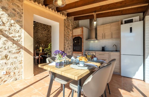 "Son Catlar", 3-room house 60 m2. Beautiful and rustic furnishings: living/dining room with open-hearth fireplace, dining table, satellite TV, digital TV and fan. 1 room with 2 beds, electric heater, air conditioning, fan and forced-air heating. 1 room with 1 french bed (150 cm), electric heater, air conditioning, fan and forced-air heating. Open kitchen (oven, dishwasher, 4 ceramic glass hob hotplates, toaster, microwave, freezer, electric coffee machine). Shower/WC. Heating not available in all rooms. 2 terraces 25 m2, covered. Terrace furniture, barbecue, deck chairs (4). Facilities: washing machine, iron, children's high chair, baby cot for up to 2 year olds, hair dryer. Internet (WiFi, free). Please note: non-smoking house. Maximum 1 pet/ dog allowed. ETV4841 ESFCTU00000701100035000500000000000000000000ETV/48419