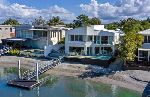 This sophisticated property resides in the prestigious Noosa Sound canal estate, known by locals and holidaymakers as Hideaway Island. Ideal for a peaceful and secluded getaway, this waterfront home sleeps 10 guests across 4 expansive bedrooms and boasts 4 modern bathrooms, a floating pontoon and a private shoreline.