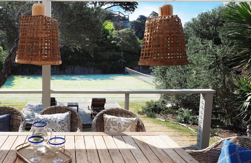 Kitchen and living area open onto large covered decking overlooking grassed area, landscaped garden and mod grass tennis court. Alfresco 10 seater dining table with additional seating and couch. Weber BBQ.