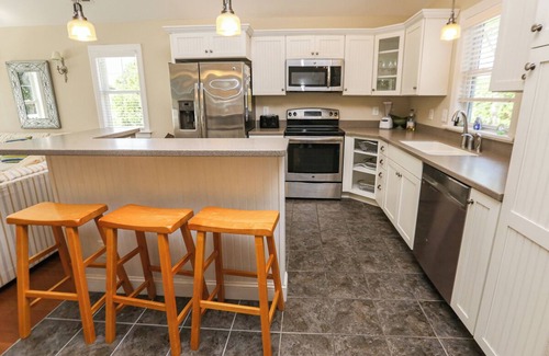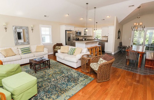 Bedroom (with King and TV and full bath with shower); living area with TV/DVD player; dining area with seating for 8 - 9; kitchen with breakfast bar with seating for 3; powder room; sunroom with Queen sleep sofa.