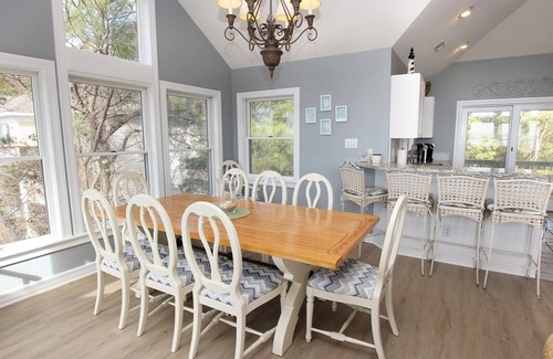 Extras: Private Pool (14 x 28), Hot Tub (4), 6 TVs with Roku, high-speed wireless internet, stereo/CD, book library, pool table, 2 outside showers, shared pier with 12' x 16' platform over the sound, gas grill, park grill, parking for 5 vehicles, linens and towels provided, community water and Monteray Shores Community Amenities. No Smoking. No Pets. Seasonal Flex Stay available from September 1 - May 15. Special Events Welcome, 50 guests. House Address: 896 Sea Ridge Drive. Beds: King, 3 Queens, 2 Bunk Sets, Day Bed, Trundle. Key Type: Keyless Entry. CHECK IN LOCATION: 1023 Ocean Trail, Corolla Office.