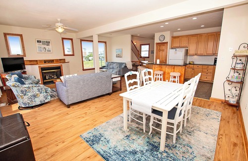 Extras: 3 TVs, screened porch, charcoal grill, 2 refrigerators, pack-n-play, game table, cornhole boards, 2 SUP boards, community soundfront dock, beach chairs and linens and towels provided. No Smoking. No Pets. Full week rentals only. House Address: 129-B Jay Crest Road. Beds: King, 2 Queens, Day Bed. Key Type: Keyless Entry. CHECK IN LOCATION: 1213-C Duck Road, Duck Office.