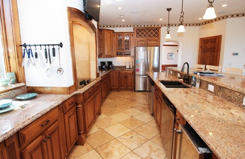 Main Living Level: Great room with TV/DVD and deck access. Private den with Queen Sleep Sofa, and TV, half bath, ELEVATOR and a sitting area. 2 formal dining rooms seating 8 and 10, huge gourmet kitchen with granite counter tops, wine fridge, 2 dish washers, TV, ice maker, 5 burner stove top, double ovens, breakfast bar seating 6, breakfast table seating 8 and deck access to deck with a gas grill. Formal Den with TV and deck access and a reading room with books. Master Bedroom with 2 Queen Beds, walk in closet and private bathroom with dual vanity, shower and jetted tub.