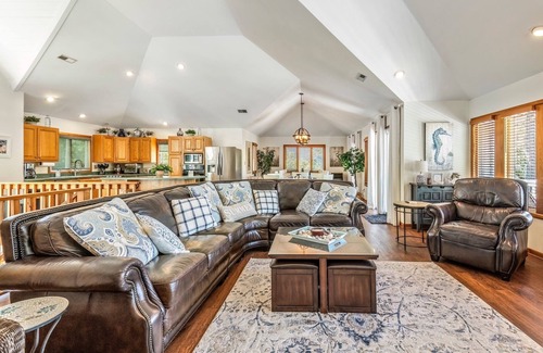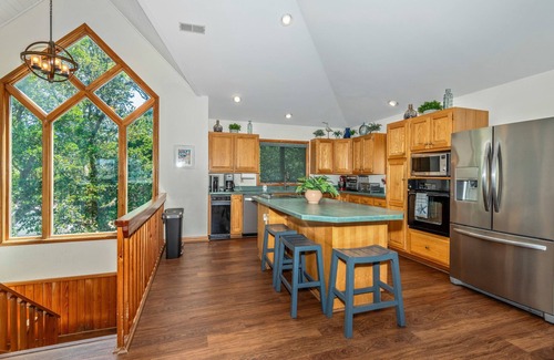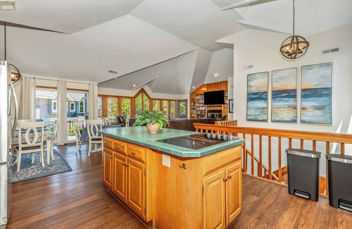 Top Level: Great room with a flat-screen TV, sound bar, wood fireplace and deck access, kitchen with counter seating for 3, dining room seating 12, game table seating 3, wine captain and screened porch access. Half bath and a King Master Bedroom with flat-screen TV and deck access.