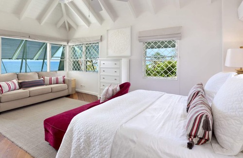 The second floor is accessed via a curved stairway and has three more bedrooms. On the western side are two rooms, one with a queen bed and sitting area and one with twin beds and a lovely bay window, these rooms share a bathroom. On the east is another large room with walk in closet and en suite bathroom. The rooms are bright and airy with large windows and gorgeous vistas of the turquoise blue sea.
