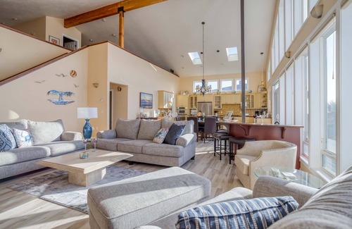 You and your guests can gather on the comfy sofas and chairs for a time around the gas fire and flat-screen TV, or maybe you’d rather converse at the circular bar pointed out to the ocean view. When dinner comes out of the luxurious kitchen with its tile flooring, granite countertops, breakfast bar, stainless appliances, and gas range, you’ll be happy to sit around the table with family and friends for an ocean-view feast. The end of the day brings more happy news: a romantic king master suite has its own fireplace, access to the deck, and a walk-in shower. A main-level queen bedroom is spacious, cheerful, and bright. The kids will flip for the upstairs loft tucked under the eaves, with their own couch and TV, an adorable “playhouse” full bath, and foosball table.