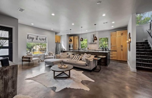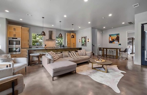A stunning 2-structure Austin compound featuring a Main house and Guest House. Modern luxury, exceptional finishes, gourmet kitchen, NEW sauna, NEW hot tub, fire pit, and a ping pong room. Nestled in the sought-after South Lamar neighborhood, this home is close to local shopping, restaurants, and bars. Seven rooms with seven beds and 1 sofa bed make this home a perfect spot for accommodating large groups and families of 16!
