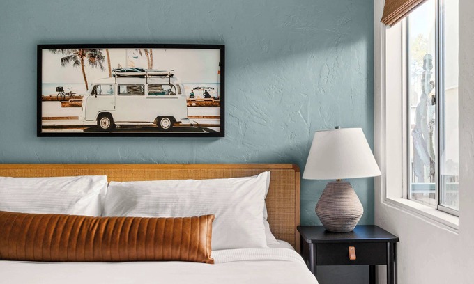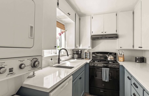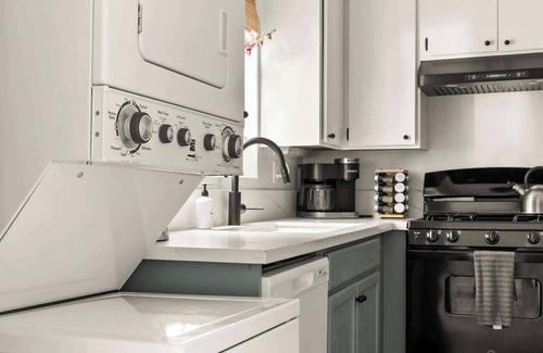 With coastal bohemian vibes throughout, the inviting living room features a comfortable couch that doubles as a queen sofa bed, a ceiling fan, and a flatscreen TV. Plus there is a quaint bistro table - perfect for a meal for two. The fully equipped kitchen has everything you need for your stay, along with the added convenience of a washer and dryer. In the bedroom, you'll find a cozy queen bed and a ceiling fan to keep you cool. The bathroom includes a shower/tub combo for a relaxing soak after a day at the beach. Guests also have access to one on-site parking space for added convenience.