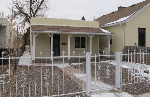 Renewable lease. Southwestern style stucco home in the emerging Swansea neighborhood. The home has been entirely renovated - refinished hardwood floors, new best in class, weather-proof kitchen and bath laminate flooring, repainted interior and exterior, ceiling fan, security light, gated, fenced, weather-sealed exterior as well as double insulated windows and doors. Two bedrooms plus a study with a barn door. Renovated plumbing and electrical. Updated furnace. Updated gas stove and refrigerator. It has sizeable basement storage and parking for four cars. This home has the advantages of being situated in a venue with a Denver Public Library, City recreation center, medical clinic, Brighton Boulevard's restaurants and it is two blocks from RTD light rail and bus lines. It has immediate access to I70 and I25 but is in a quiet neighborhood. You can grow with a neighborhood that has a new park and soccer fields currently under construction and the National Western Complex's ongoing redevelopment.