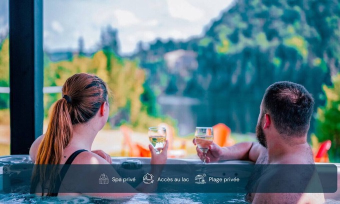 Enjoy our luxurious chalet with private lake access, a spa with breathtaking views, waterside bliss, a volleyball court, and countless summer outdoor activities!