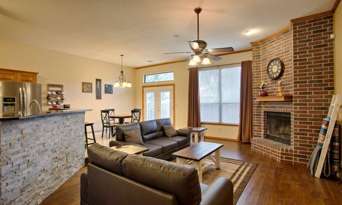 During your stay, you can spread out and relax on a new sofa and loveseat and enjoy a 55 inch, 4K flat screen TV with access to Netflix, wiifi and Internet TV. The kitchen nook has a 4-seat table and the formal dining features a beautiful farmhouse table that can seat 8 people comfortably. The master suite offers a comfortable queen-sized bed with a pillow top mattress, microfiber sheets and a flat screen TV. The master bathroom includes double sinks, a separate tub and shower and a big walk-in closet. Two guest bedrooms feature a queen-sized bed and the third has a fun, twin-over-full sized bunk bed that can comfortably sleep 3 guests. The second living room is stocked with board games, a large sleeper sofa, and a couple of chairs that create an area away from the TV for some fun, quality family time! Enjoy the mature trees and quiet fenced in backyard with outdoor seating and gas grill with propane provided.